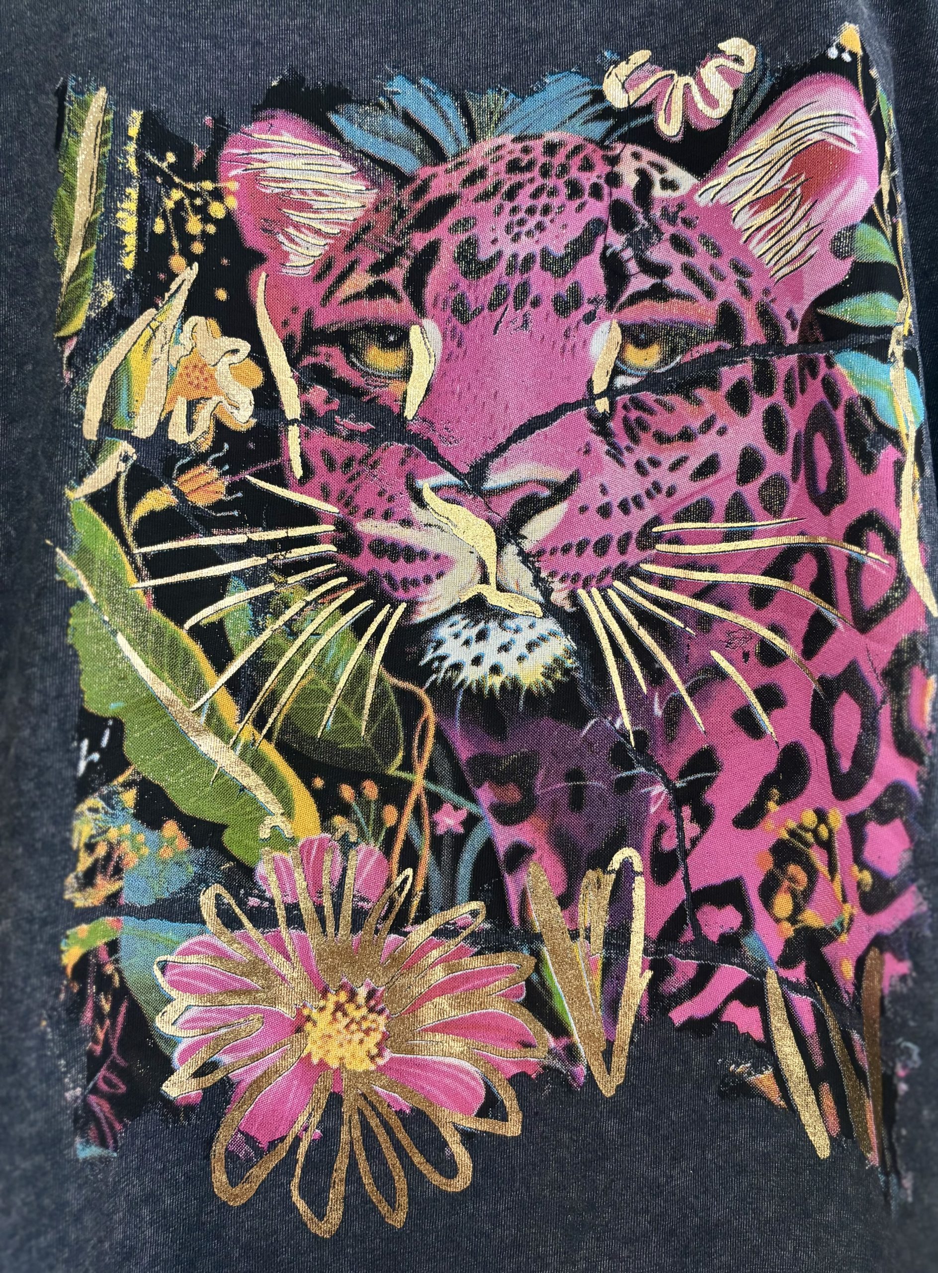 Está confeccionada en algodón negro lavado con efecto vintage, que le da ese acabado desgastado que tanto se lleva. El protagonista absoluto: un leopardo en fucsia intenso, rodeado de flores tropicales y detalles en dorado que le aportan luz y sofisticación.