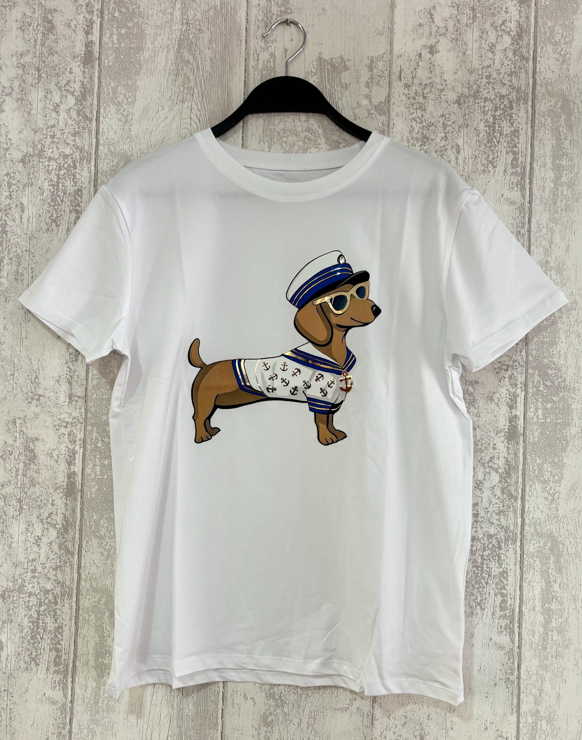 Confeccionada en algodón blanco suave, tiene un diseño sencillo pero con un toque original irresistible: un perro salchicha vestido de marinero, con gafas de sol y su uniforme a rayas con anclas. El detalle del ancla dorada en el pecho lo remata todo con clase.